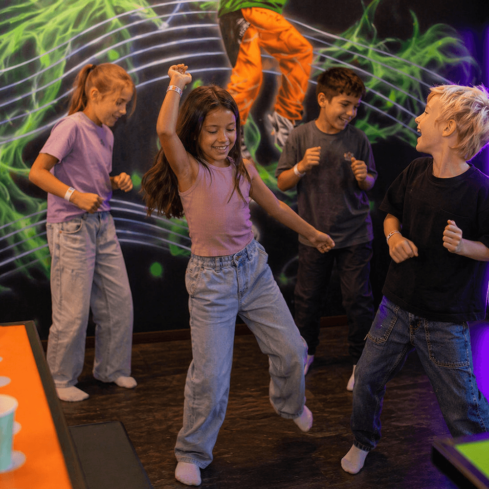 När du kliver in i discorummet är stämningen redan på plats. Dämpad belysning, färgerna skiftar och rummet känns direkt som en fest. Bordet står redo och allt är förberett – det är bara att kliva in och börja fira. När det är dags att ta sig ut i leklandet fortsätter energin i samma tempo. Dans, rörelse och lek går hand i hand – och det är lätt att hoppa in igen när nästa låt drar igång.